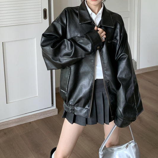 Chic Trendy Winter Brown Black Leather Jacket Skirt Two Piece Set