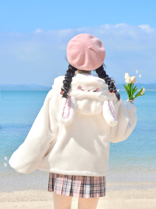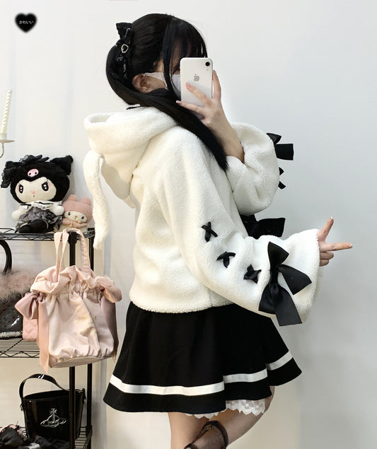 Kitten Bullet Wanted Rabbit Plush Rabbit Ear Button Lace-up Black & White Winter Jacket