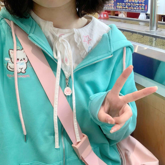 Angel Wings Meow Mint Green Cute Cat Ears Hoodie Jacket