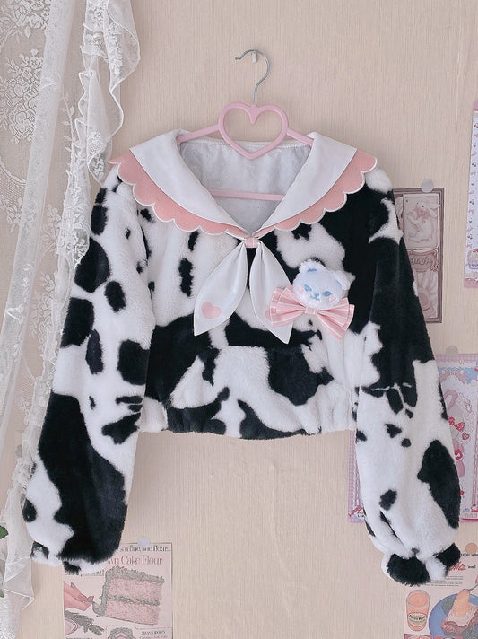 Cow Pattern Black White Pink Sailor Collar Plush Jacket