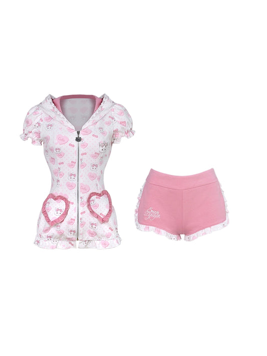 Serendipity Homey Cute Pink Cat Hoodie & Shorts Two Piece Set