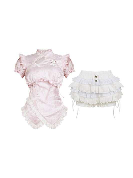 Serendipity Sweet System Peach Camellia White Cami & Pink Bloomers Two Piece Set