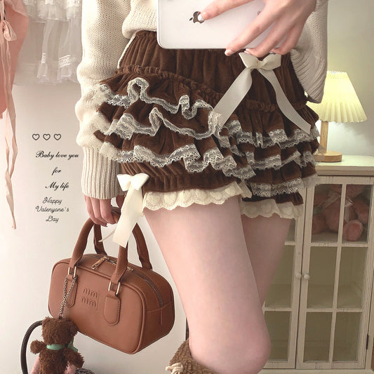 Dormir Doll Lolita Winter Velvet Lace Ruffled Black Brown Cream Bloomers Shorts