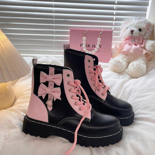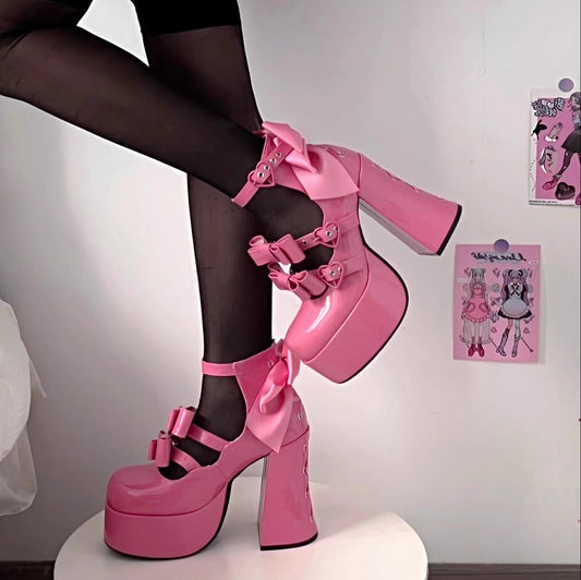 Moe Heart Butterfly Bow Buckle Strap Black White Pink Hot Pink Lolita Platform High Heels Shoes