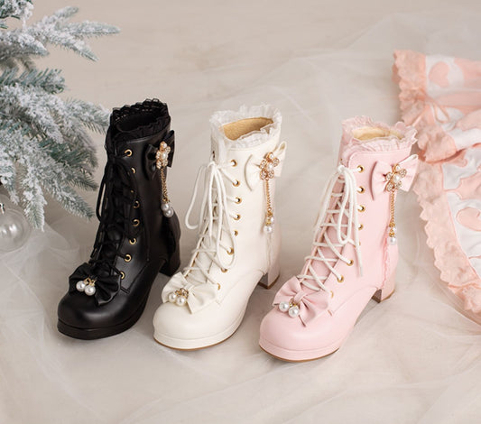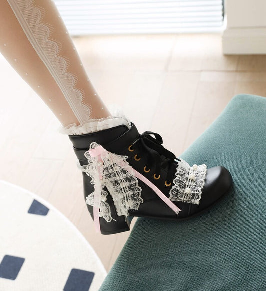 Princess Ribbon Lace Pink Black White Winter Zip Up Little High Heels Boots