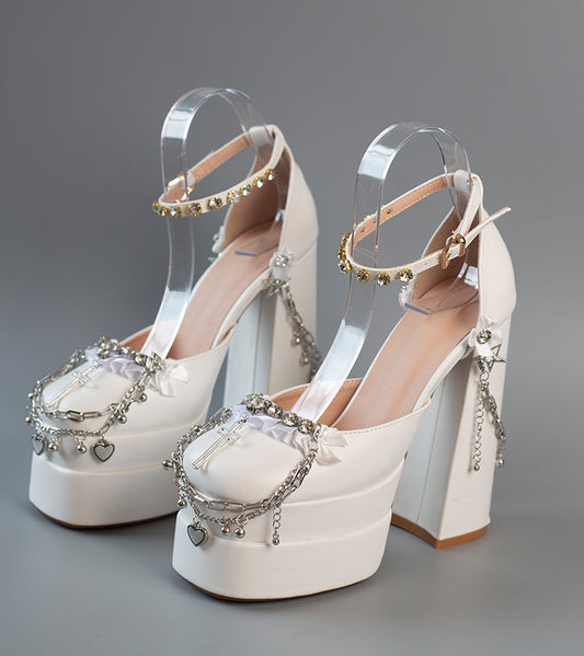 Bingo Jade Punk Devil Wings Cross Heart Silver Chains High Heels Shoes