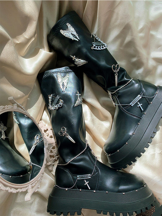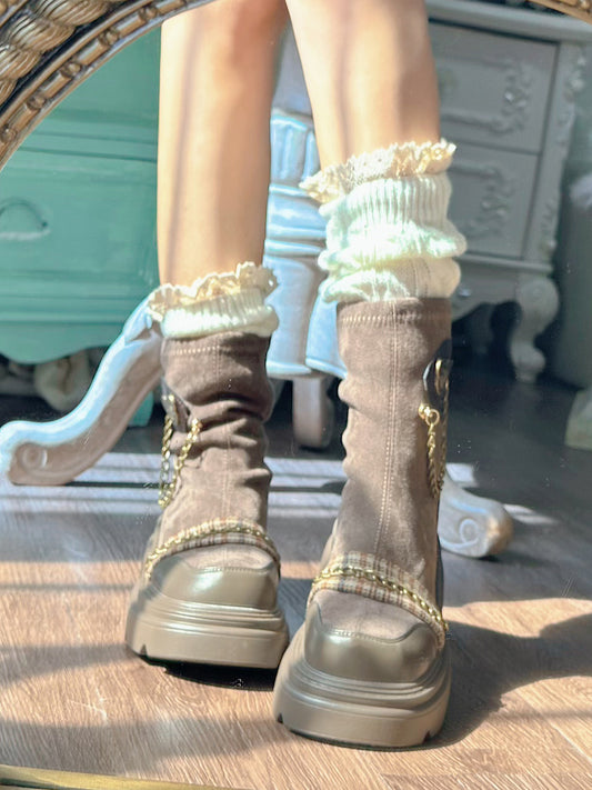 Pinky Dark Academia Winter Chains Black Brown Boots Shoes