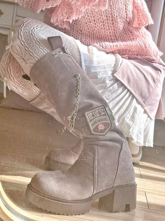 Pinky Brown Autumn Winter Academia Leather Knight Boots