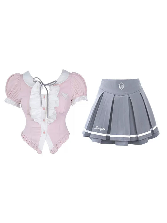 Serendipity Korean Academy Pink Top & Gray Pleated Skirt Two Piece Set