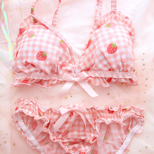 Strawberry Plaid Pattern Bra Set Pink Panties Underwear Lingerie