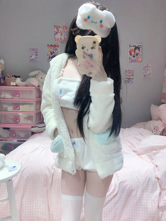 Fluffy Cinnamon Dog White Blue Lingerie Bra Panties Pajama Set