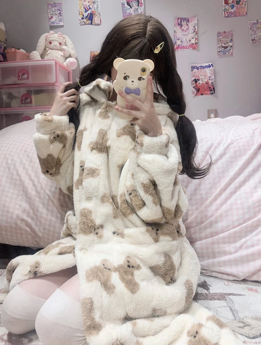 Winter Teddy Bear Soft Fleece Long Hooded Bathrobe Pajama