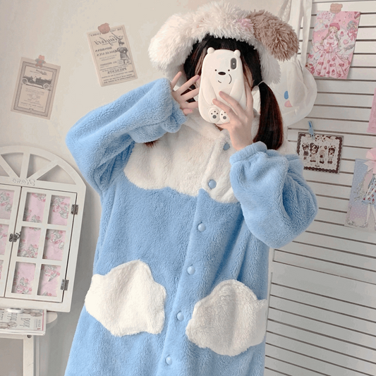 Cartoon Cinnamon Dog Hooded Nightgown Full Overall Blue Cloud Bathrobe Pajamas