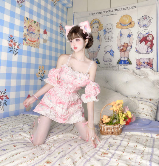 Candy Fairy Pink Melody Cartoon Camisole Puff Sleeve Top & Skirt Pajamas Two Piece Set