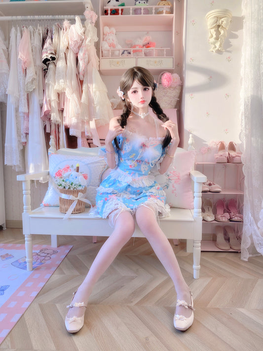 Candy Fairy Cute Blue Cinnamon Dog Lace Camisole Puff Sleeve Top & Skirt Pajamas Two Piece Set