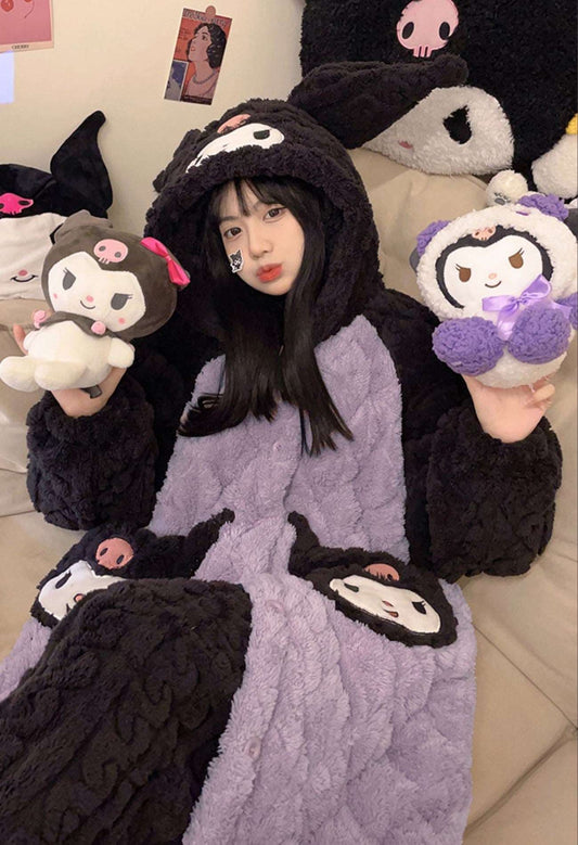 Black & Purple Devil Cartoon Thick Winter Pajamas Hooded Bathrobe & Pants