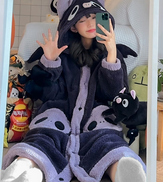 Halloween Black Spooky Bat Ears Hooded Nightgown Long Bathrobe Pants Pajamas