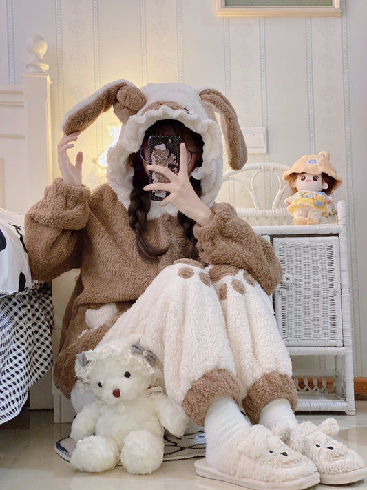 Rabbit Ears Hooded Pink & Brown Thick Warm Winter Bathrobe Nightgown Pajamas Set