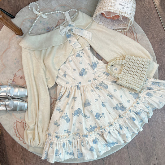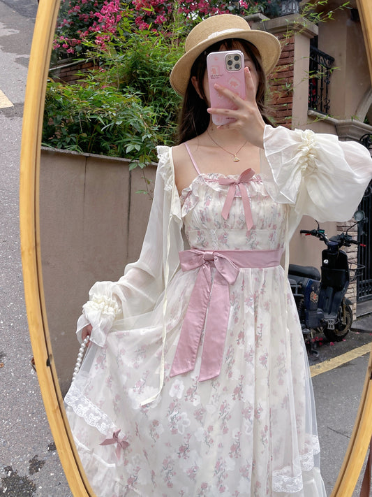 Ruellia Rose Floral Princess Pink & Blue Strap Dress Jacket Two Piece Set