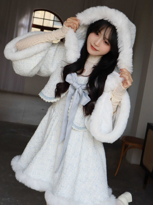 Blue Angel Winter Plush Strap White Dress & Little Hooded Fur Jacket Cape Two Piece Set