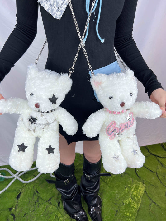 Black White Bear Doll Cute Plush Chain Star Love Collar Messenger Bag