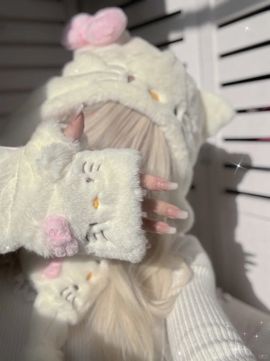 Pink Bow Kitty Plush White Winter Hat Scarf Gloves Set