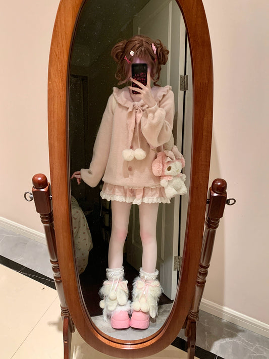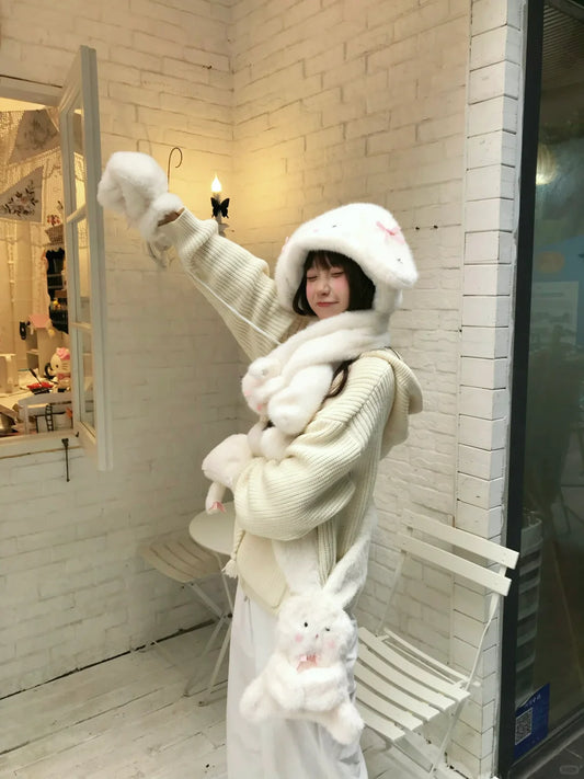 Peach Bubble White Rabbit Plush Winter Hat Scarf Gloves Bag Set