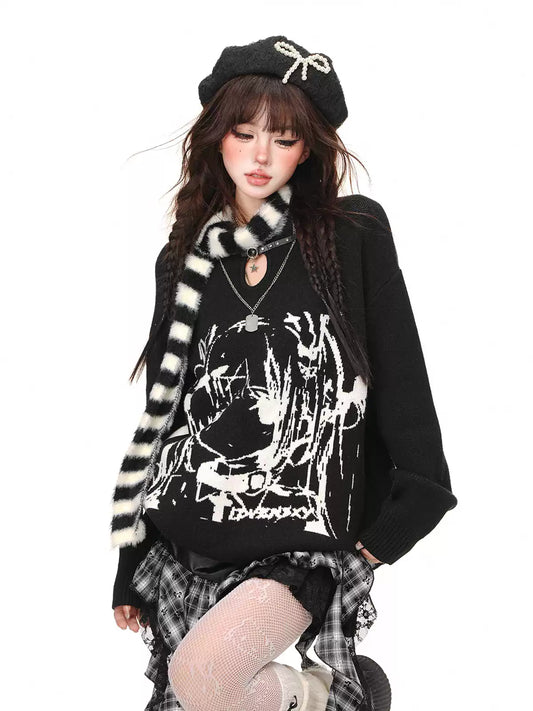 Young Eyes Anime Stimulation White Black Sweater Striped Scarf