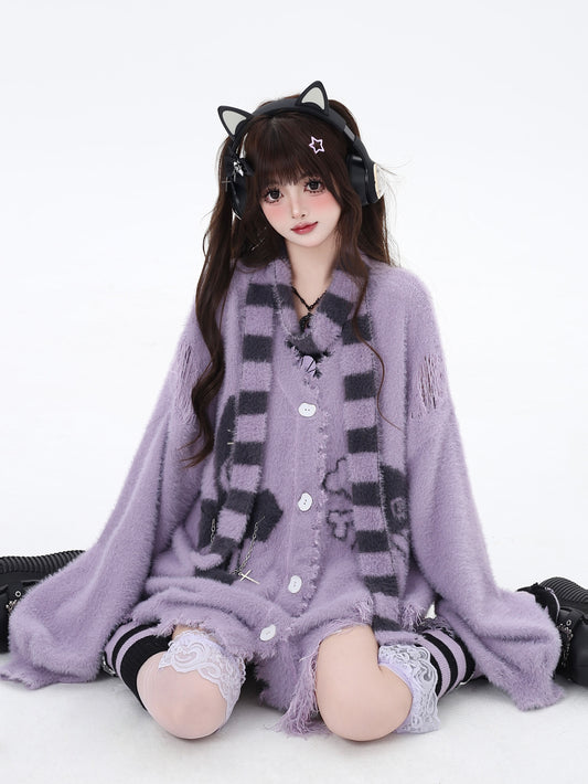 Crazy Girl Doomsday Purple Black Gray Fuzzy Sweater & Striped Scarf Set