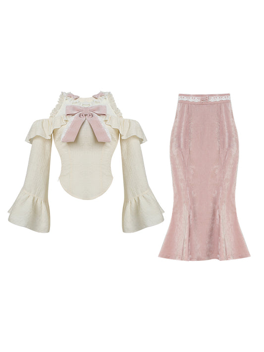 Serendipity Daily Style Velvet Sweet Tea Cream Top & Long Pink Skirt Two Piece Set
