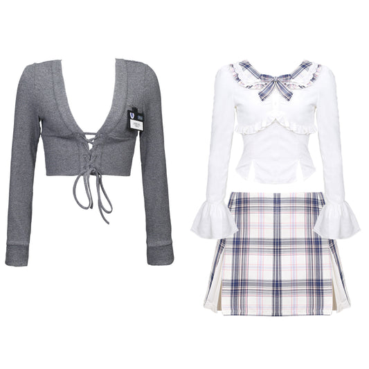 Serendipity Seoul Academia Gray Cardigan & White Skirt & Plaid Skirt Three Piece Set