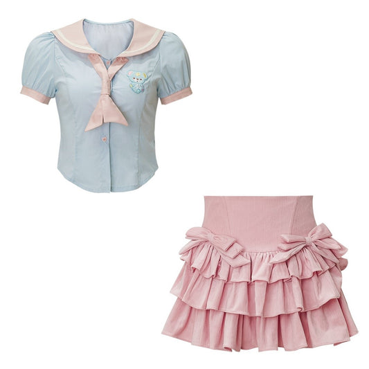 Serendipity Coquette Sweet Sailor Collar Blue Puff Sleeve Shirt & Pink Ruffled Mini Skirt Two Piece Set