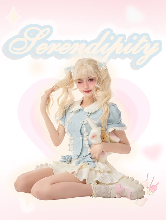 Serendipity Coquette Bear Doll Collar Blue Puff Sleeve Shirt & White Tutu Mini Skirt Two Piece Set