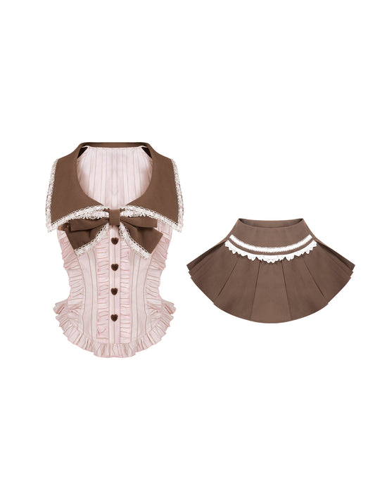 Serendipity College Department Chocolate Strawberry Pink Top & Brown Skirt Two Piece Set