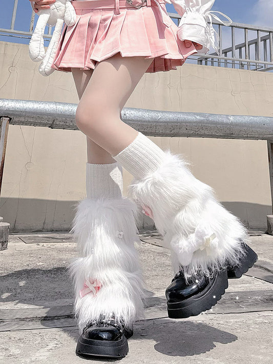 Y2K White Cat Furry Fur Leg Warmers & Bag