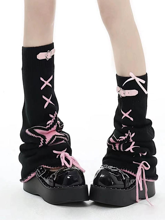 Heart Leather Buckle Knit Pink Black White Leg Warmers