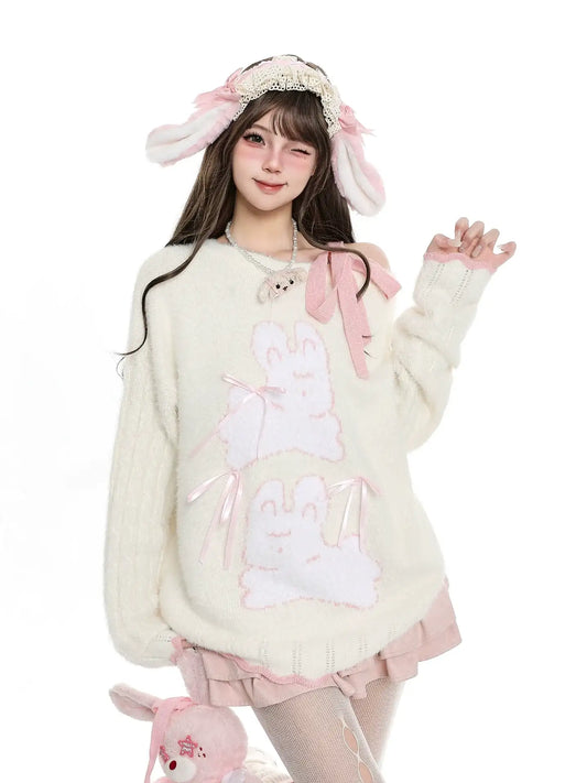 Mew Mianmian Rabbit Ear Collar Pink Gray White Knit Sweater