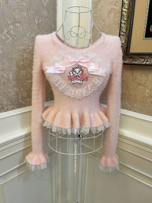 Sweetheart Princess Winter Marie Cat Pink Fuzzy Cropped Sweater & White Ruffled Skirt Two Piece Set