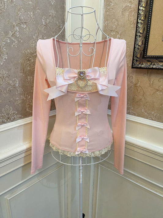 Sweetheart Princess Balletcore Pink Bow Lace Shirt Top & Skirt Two Piece Set