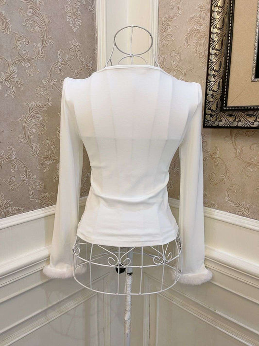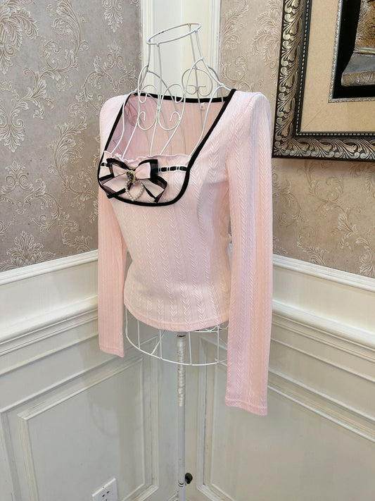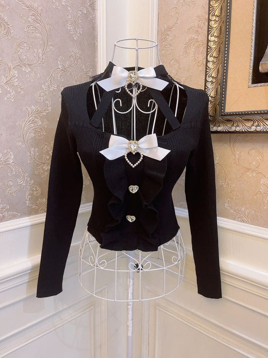 Sweetheart Princess Elegant Bow Black & White Long Sleeve Halter Neck Knit Sweater Top