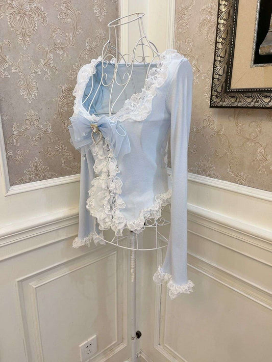 Sweetheart Princess Wood Lace Trumpet Sleeve Blue Top