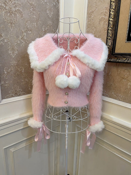 Sweetheart Princess Winter Plush Fuzzy Pink Sweater Pompom Balls & White Ruffled Skirt Two Piece Set