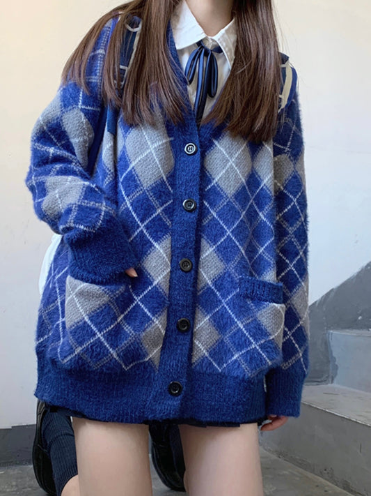 Blue White & Black Pink Diamond Argyle Pattern Cardigan
