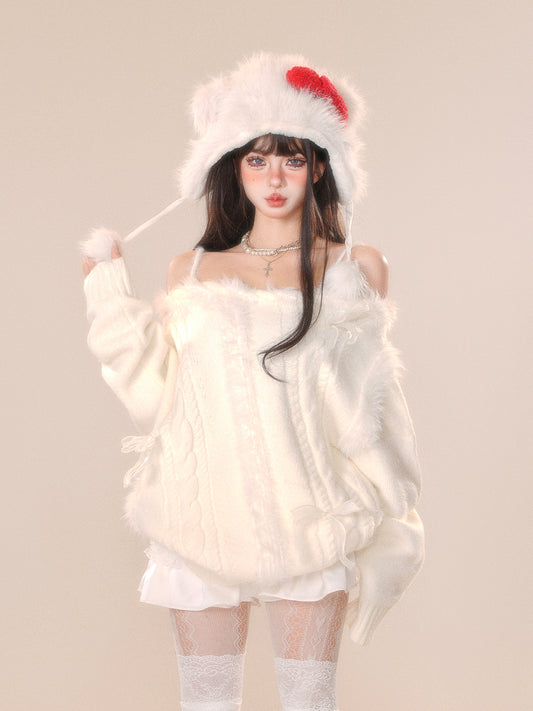 Young Eyes Cupid Kitty White Pink Off Shoulder Fuzzy Sweater