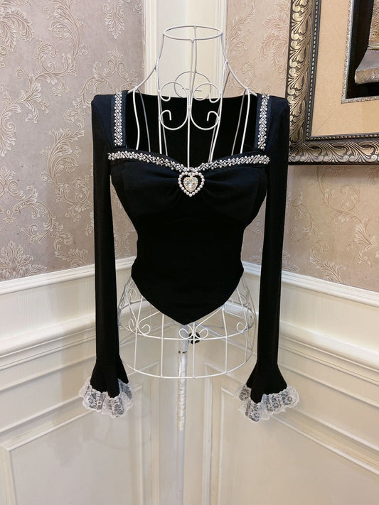 Sweetheart Princess Pearl Lace Velvet Black White Camisole Top