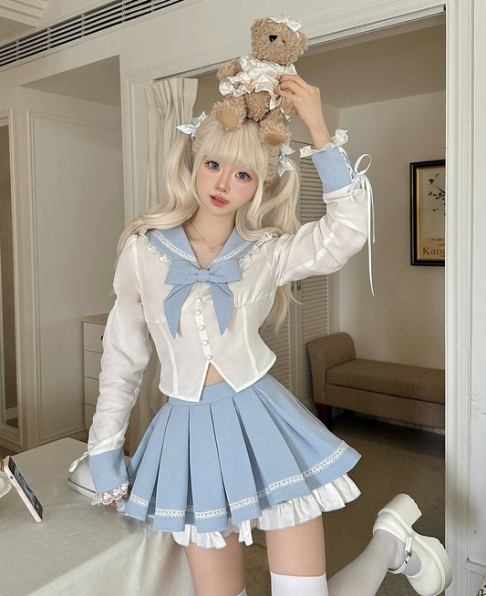 Seifuku Sailor School Uniform Pastel Blue White Blouse Shirt & Skirt Two Piece Set