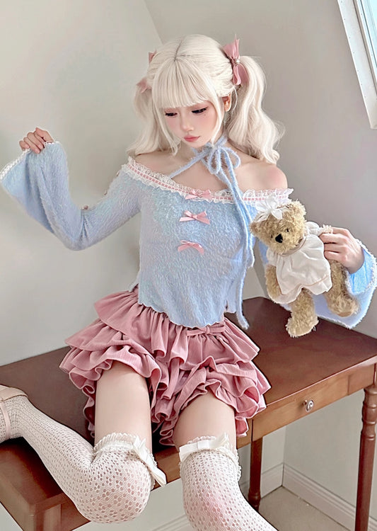 Coquette Sweet Bow Blue Sweater & Pink Ruffled Skirt Two Piece Set