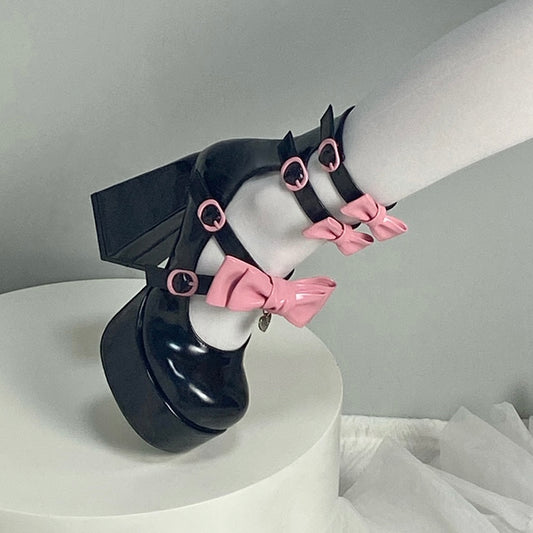 Moe Heart Butterfly Bow Buckle Strap Black White Pink Hot Pink Lolita Platform High Heels Shoes