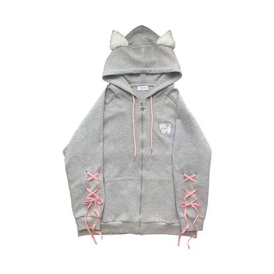 Cute Gray Cat Ears Y2K Coquette Ribbon Hoodie Jacket