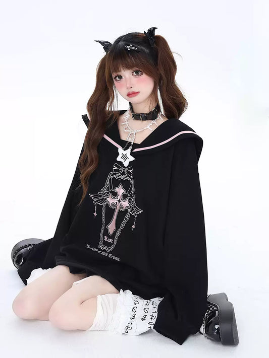 Crazy Girl Holy Cross Sailor Collar Pink Black Sweatshirt